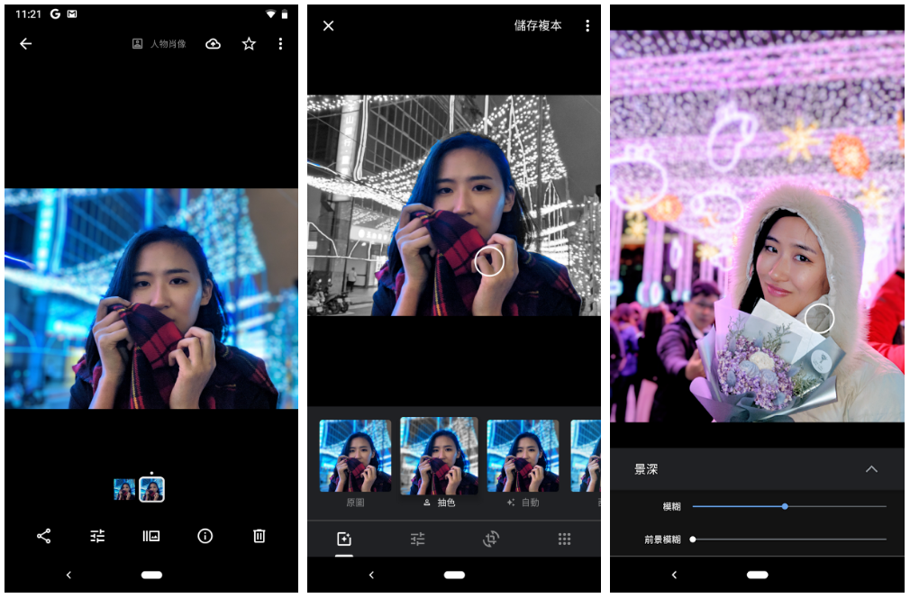 Google Pixel 3 的內建相簿即為 Google 相簿,在預設人像模式的編輯功能上有改變焦點與抽色這兩種玩法,而改變模擬景深的光圈大小功能(光圈愈大,則景深愈淺、背景愈模糊)則藏在編輯中的「編輯」,也就是點到編輯圖片功能要再點一次編輯才會出現,可以控制模糊程度與前景是否也模糊。另,每次拍人像模式,Pixel 3 都會存下兩張照片,一張正常,一張有景深模式。
