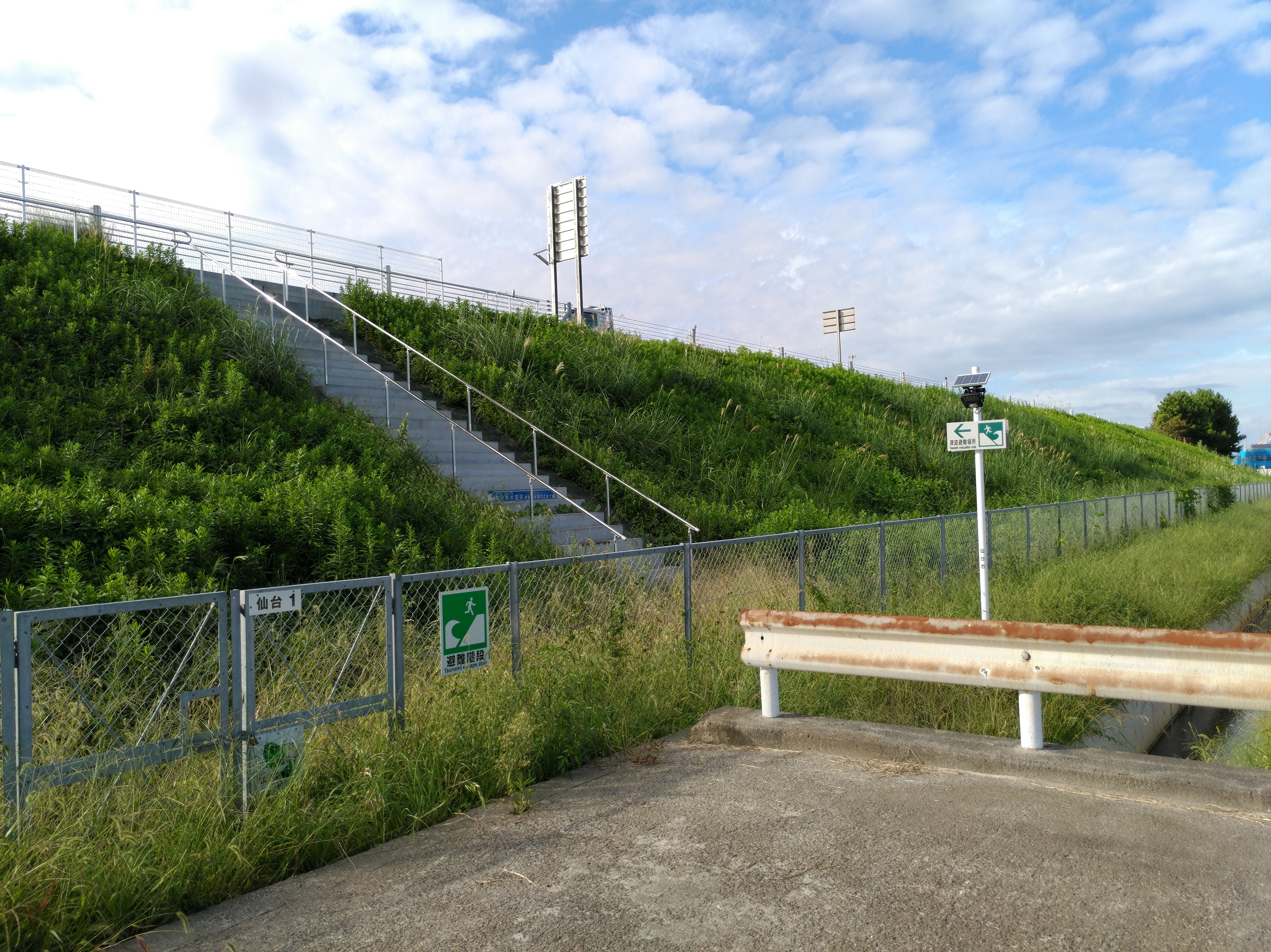荒濱小學校附近,在那時已經是一片荒地,間或還能看到日本各地的「加油」打氣的旗幟、布條,以及剩下殘骸的房舍,但是這裡的居民已經永久的遷到內陸,這裡未來任由大海氾濫,學校將作為避難塔,旁邊的東北高速公路也設置了逃生梯讓人準備逃上高速公路以避海嘯。