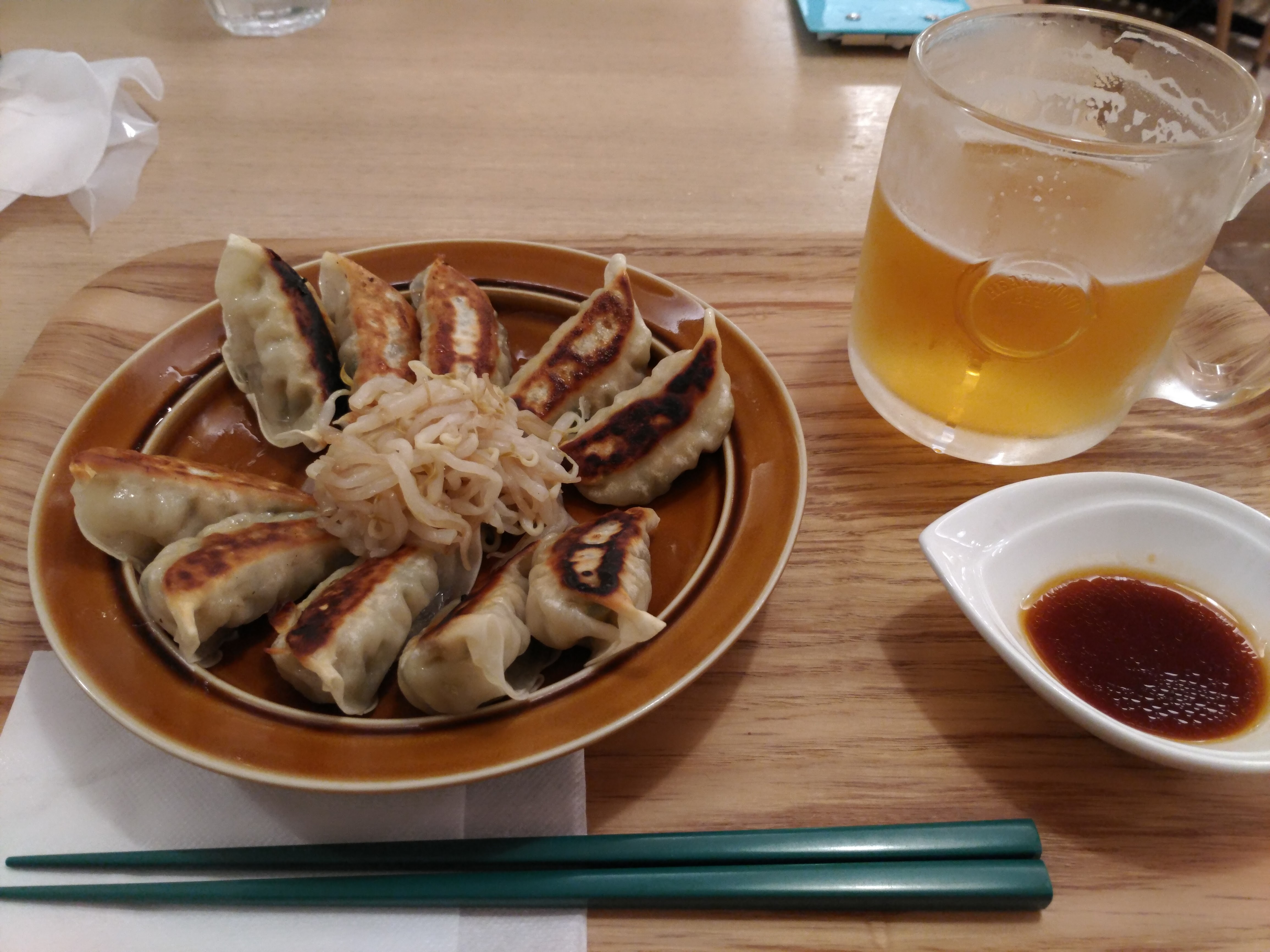 仙台的醬油拉麵+蔬菜蒸餃的set,拉麵上的炸雞是像豆包的東西炸的。醬汁盤左到右是醬油、碎玉米醬、辣油(香料油?總之很香)